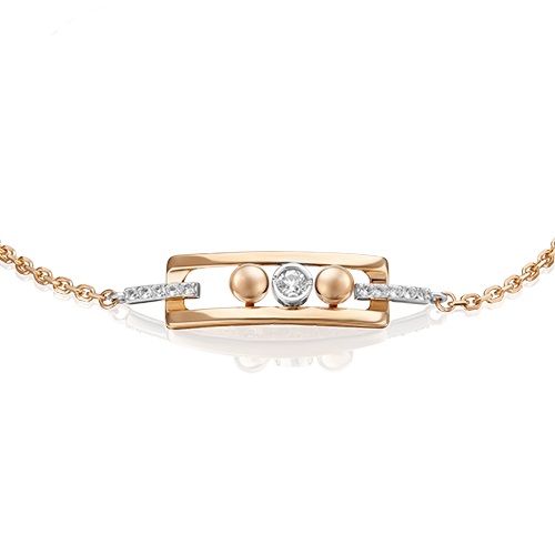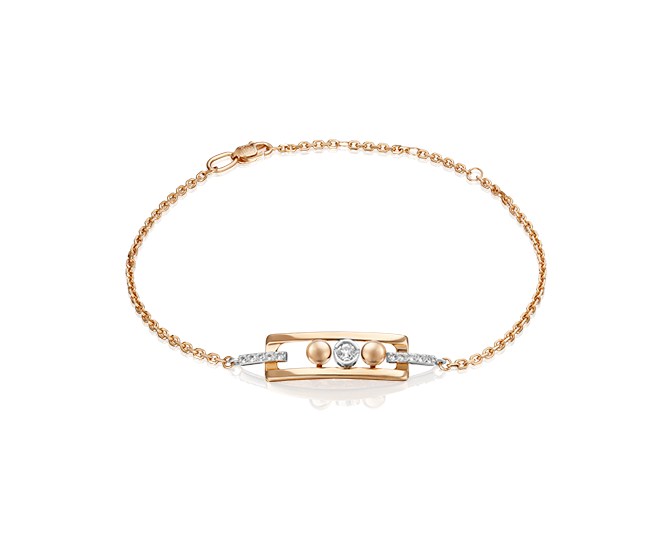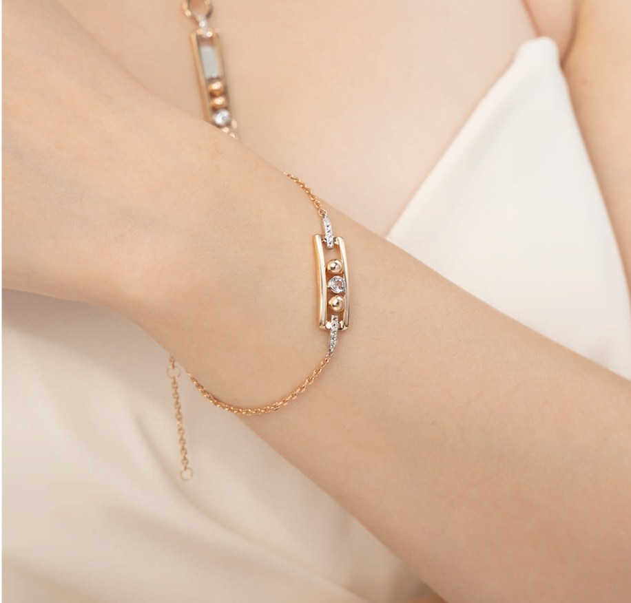 Браслет «Дуэт форм» из красного и белого золота 585 пробы с натуральными white-топазами из коллекции PLATINA LINE от ювелирного бренда PLATINA. Длина браслета регулируется. Дизайн украшения в стиле геометрия и минимализм. Декоративная часть выполнена с комбинацией геометрических форм в одном силуэте – прямоугольника и шаров. Украшение инкрустировано натуральными white-топазами, закрепка которых выполнена вручную. Браслет подойдёт к повседневному и деловому гардеробу, для коктейльных, праздничных и неформальных мероприятий.
