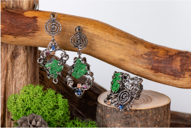 Кольцо "Ведающая" | Бр Черный ,Друза Уваровита ,Кианит ,Родолит ,Сапфир |