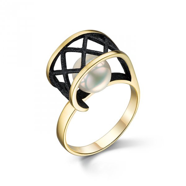 Кольцо, Золотое покрытие | Жемчуг ,Эмаль Черный