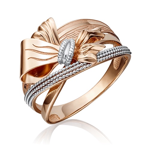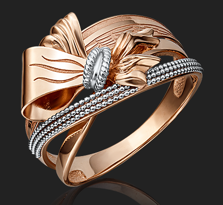 Изысканное кольцо «Бант» из красного золота 585 пробы из коллекции ИЛЛЮЗИИ от ювелирного бренда PLATINA. Дизайн украшения сложный, многоуровневый. Дополняют дизайн фактурный узор, нанесённый с помощью лазерной гравировки, покрытие белым родием и дорожки из миниатюрных золотых гранул. Родирование выполнено вручную. Кольцо подойдёт для праздничных и вечерних мероприятий, а также к деловому и повседневному гардеробу.