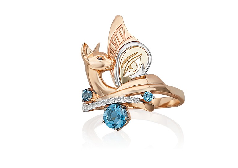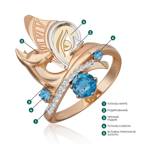 Сложное кольцо из красного и лимонного (желтого) золота 585 пробы с топазами из коллекции PLATINA ART от ювелирного бренда PLATINA. Дизайн украшения в стиле сюрреализм. Декоративная часть выполнена в виде фантазийной композиции из силуэтов кошки с крылом, стрелы, глаза и циферблата часов. Украшение инкрустировано натуральными топазами London и white. Дополняет дизайн белое родиевое покрытие. Закрепка камней и родирование выполнены вручную. Кольцо подойдёт для коктейльных и вечерних мероприятий, а также к повседневному и деловому гардеробу.