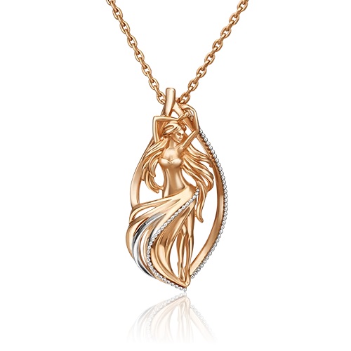 Фантазийная подвеска из красного и белого золота 585 пробы, среднего размера. Дизайн украшения объемный, рельефный, с силуэтом знака зодиака Дева. Изделие декорировано дорожкой из миниатюрных золотых гранул и украшено фактурами, выполненными при помощи лазерной гравировки. Украшение подойдёт к повседневному и деловому стилю, а также для неформальных мероприятий и бизнес-встреч.