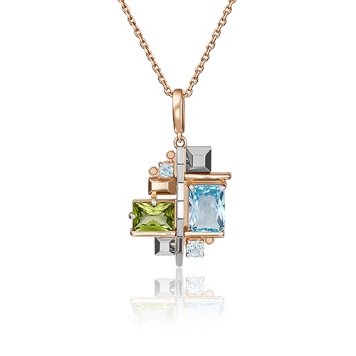 Стильная геометричная подвеска, дизайн которой вдохновлён идеей городского пейзажа. Лаконичные линии складываются в безупречную мозаику из натуральных вставок и эффектного микса белого и красного золота. Нежный блеск топазов идеально дополняет насыщенный оливковый оттенок хризолита. Асимметричный силуэт придаёт данной модели динамичность, а образу завершённость и конкретность. Идеальный выбор для бизнес-леди: украшение прекрасно впишется и в классический образ, и в деловой casual.