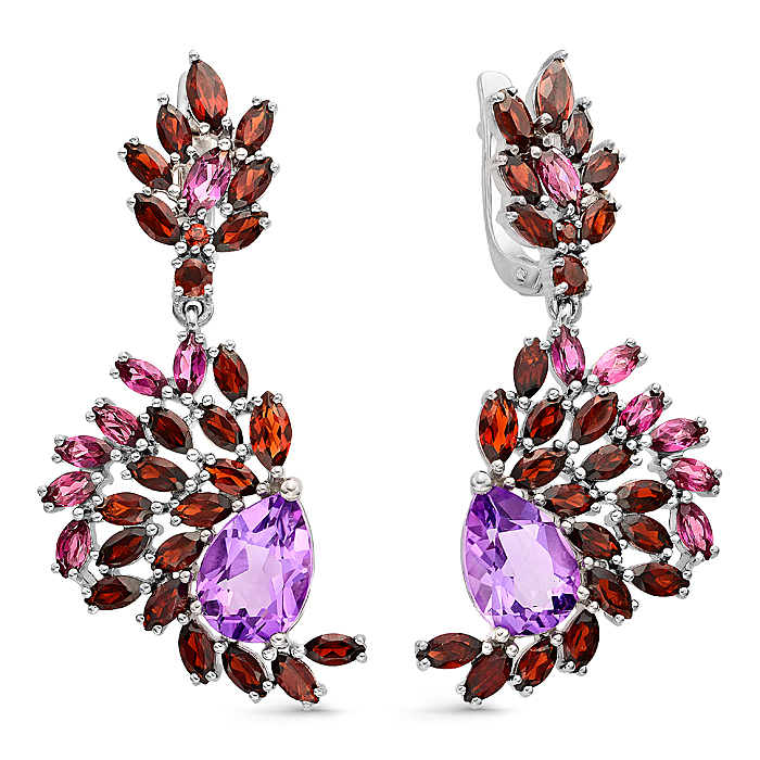 Серьги из серебра с камнем аметист, Родолит, Гранат