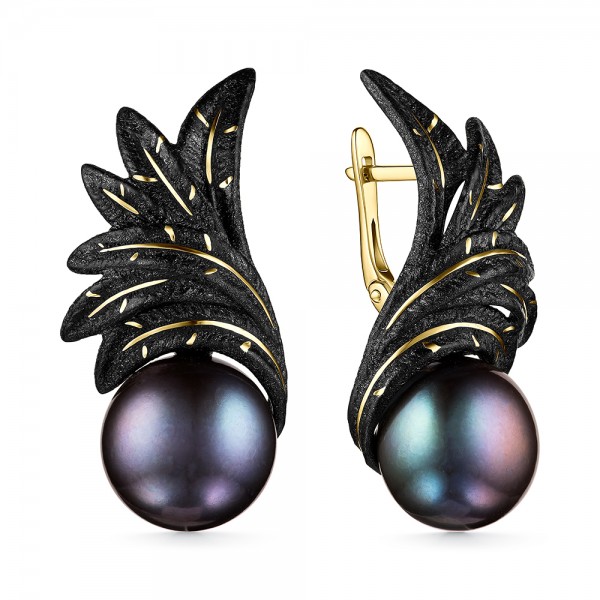 Серьги, Золотое покрытие | Жемчуг Коричневый ,Эмаль Черный |