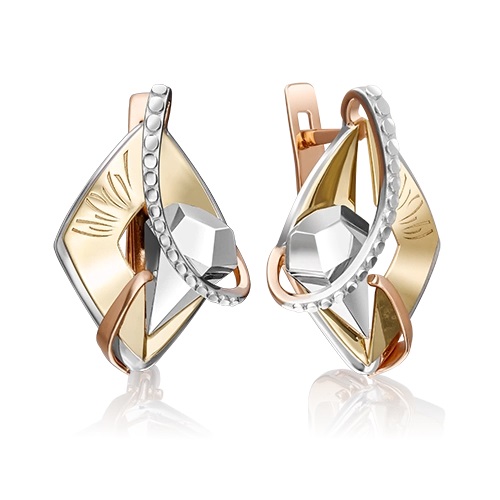 Нетривиальные серьги из красного, лимонного (желтого) и белого золота 585 пробы из коллекции ИЛЛЮЗИИ от ювелирного бренда PLATINA. Дизайн украшения объёмный, сложный и многоуровневый. Рельефные узоры нанесены с помощью лазерной гравировки. Силуэт объёмного многоугольника, выполненный с помощью алмазной грани, имитирует огранку камней. Серьги подойдут для вечерних и праздничных мероприятий, а также к деловому и повседневному гардеробу.